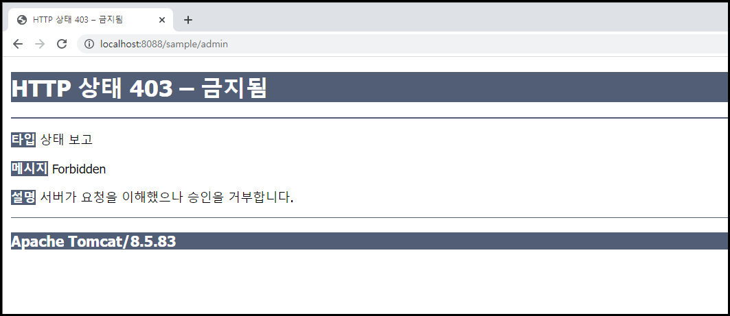 특정한 사용자가 로그인은 했지만 URI를 접근할 수 있는 권한이 없는 상황이 발생할 수도 있습니다. 이 경우에는 접근 제한 에러 메세지를 보게됩니다. 아래와 같이 member사용자가 admin페이지를 요청했을 때 처럼요.