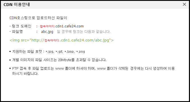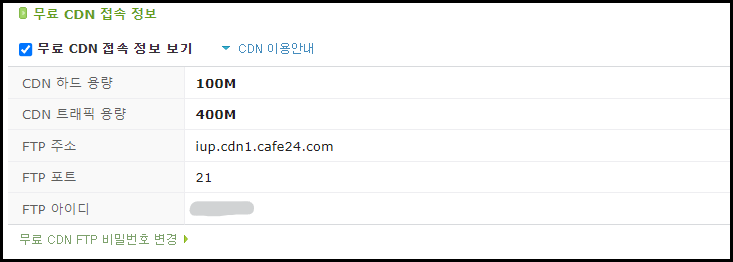 신청이 완료되면 FTP 접속서버와 포트번호, 접속 아이디 등이 출력된다. CDN 서버 세팅까지 20-30분 소요된다고 안내가 된다. 세팅완료시 이메일로 완료되었다고 연락이 온다.