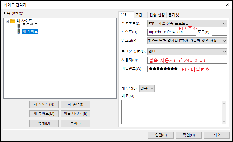 4. 파일질라(FIleZilla)에서 사이트 관리자- 새 사이트- 확인