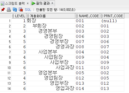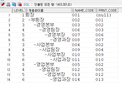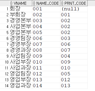 2. START WITH 최상위 루트 노드를 지정, 최상위 루트 노드인 회장의 부모노드를 NULL이므로 PRNT_CODE IS NULL로 지정