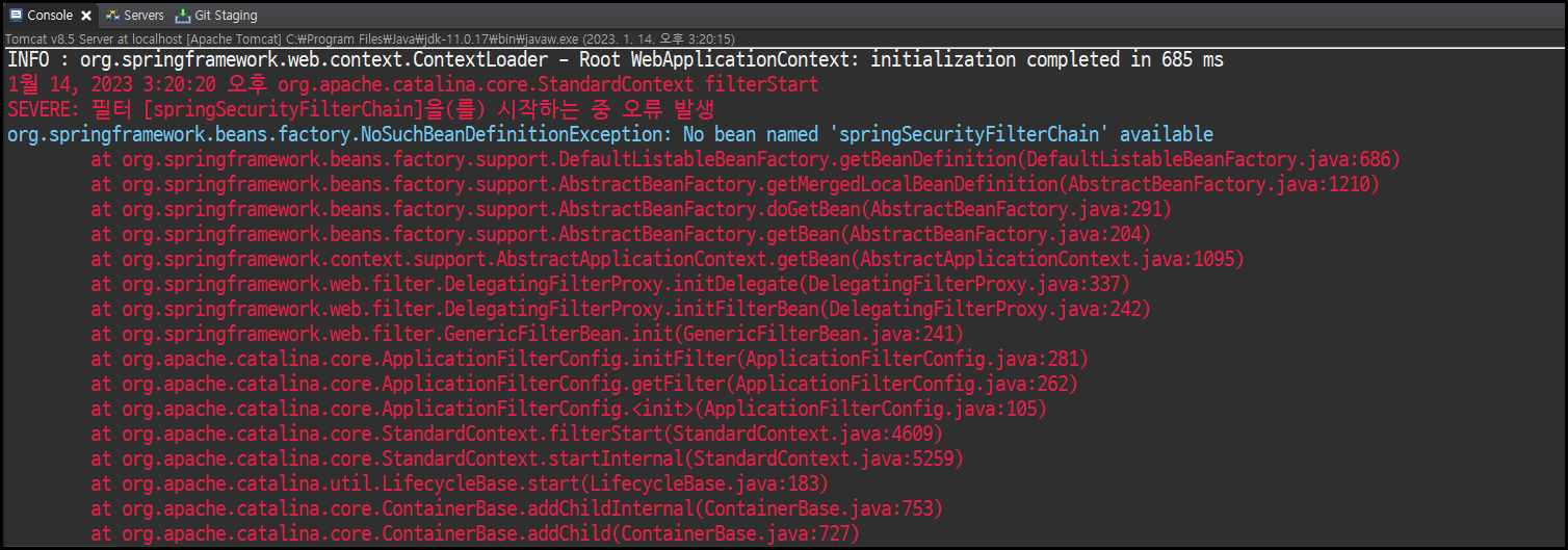 필터 작성 후 실행시 에러가 발생하는데 그 원인은 'springSecurityFilterChain' 이라는 빈이 제대로 설정되지 않아서 스프링 시큐리티의 설정 파일을 찾을 없다고 나온다.